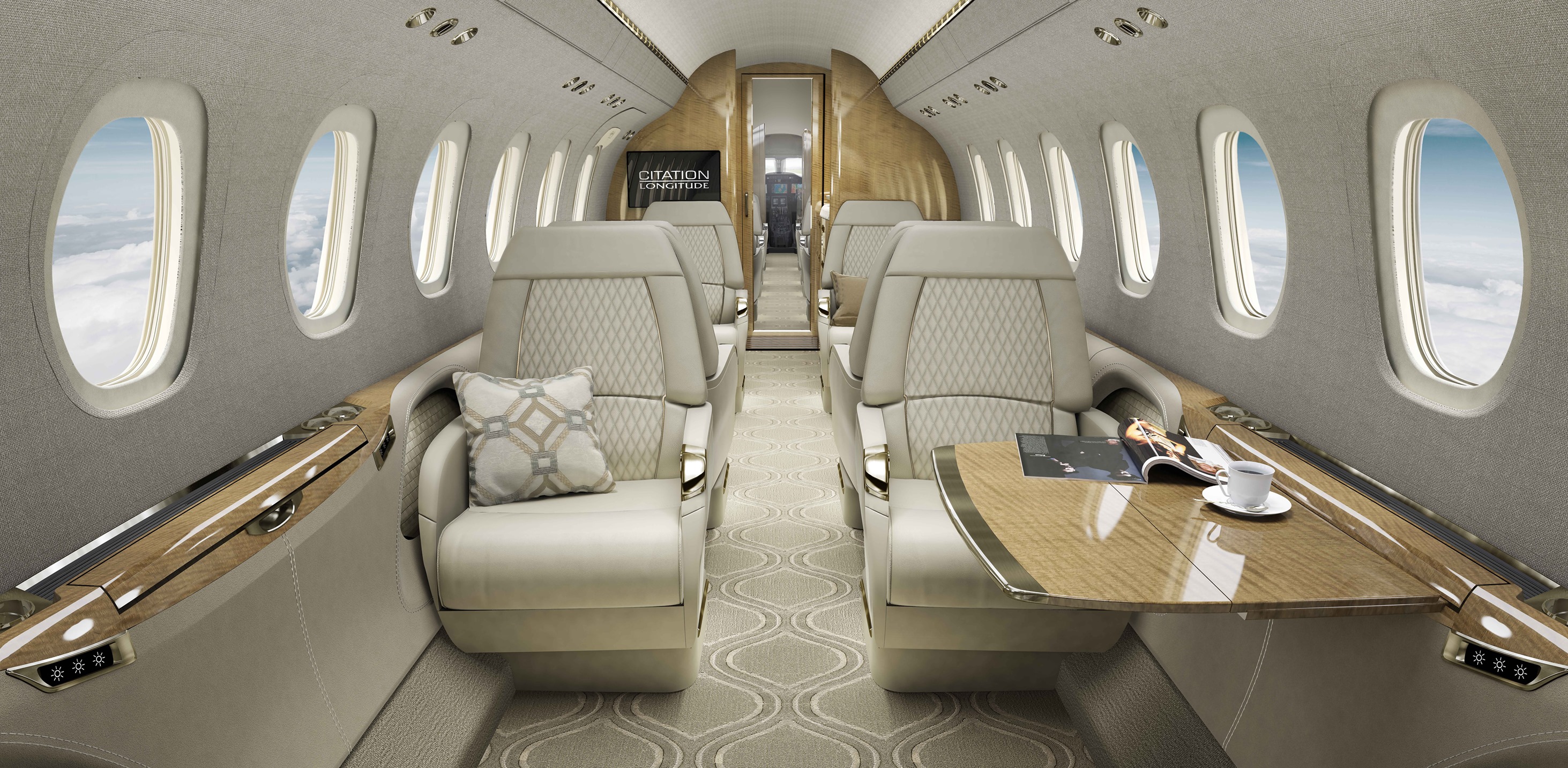 The Citation Longitude is designed to elevate passenger expectations in the super-midsize class by delivering the quietest cabin, a low cabin altitude (1,814 meters/5,950 feet), more standard features and a comfortable, bespoke interior. With seating for up to 12 passengers, including an optional crew jump seat, the Longitude features a stand-up, 6-foot tall flat-floor cabin.