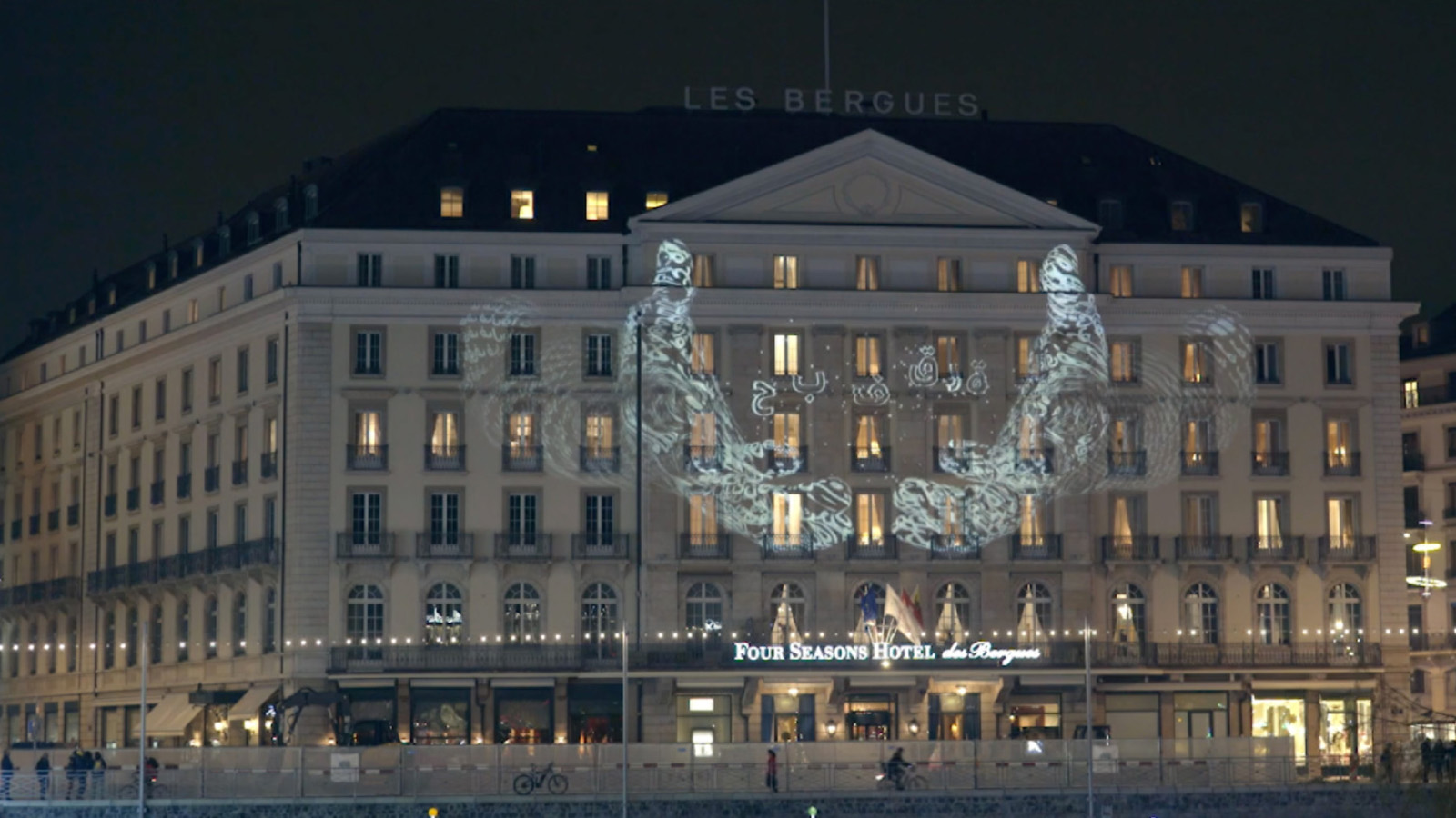 Built in 1834, the Hotel’s classical architecture serves as the base of an eight-minute visual display, combining the characteristics of its classical façade with contemporary light visuals. The display features the texts of ten international poems, written in different alphabets and languages, to highlight the vibrant spirit and diversity of the city. The collection of evocative poems is illustrated through unique typography, paying tribute to the tradition of Swiss design, emphasising their unique expertise in the field, and the beauty of fonts created by reputable calligraphers of the past and present.