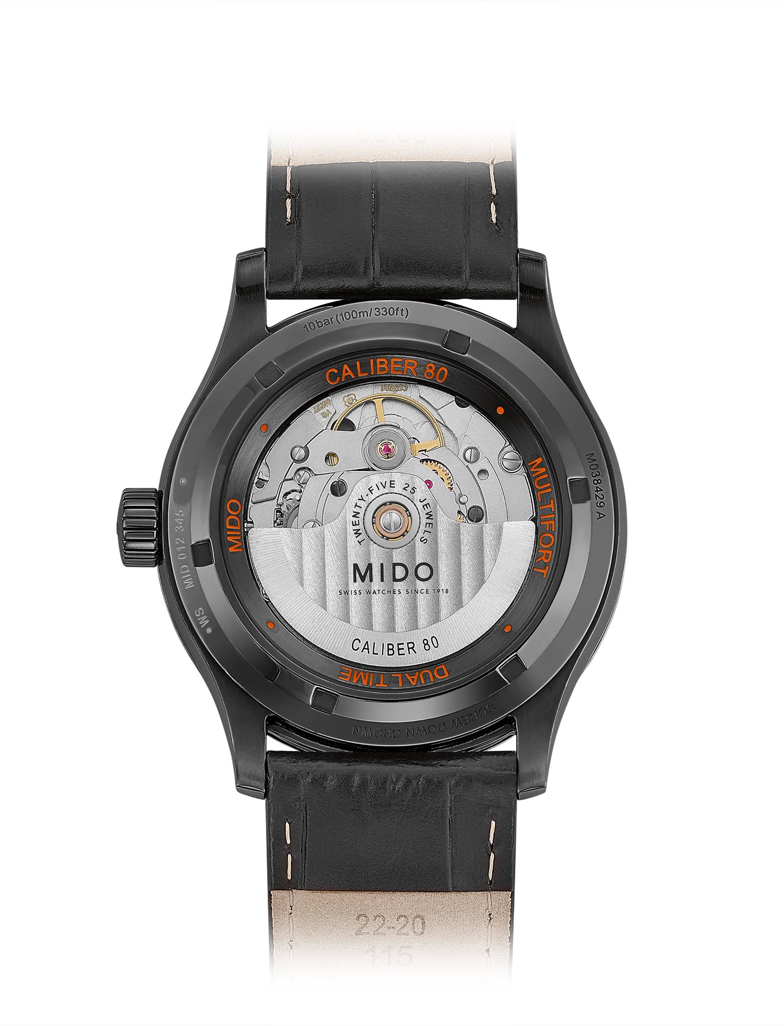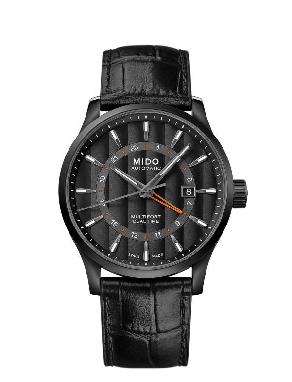 Thanks to its transparent case back, users can admire its finely decorated automatic movement as well as its oscillating weight adorned with Geneva stripes and the Mido logo. Water-resistant up to a pressure of 10 bars (100 m/330 ft), the Multifort Dual Time is fitted with a strap in black semi-matt crocodile-look genuine cow leather, with a folding clasp in black PVD-treated steel.