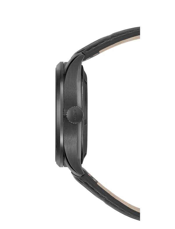 The sturdy round black PVD-treated steel case measures 42 mm in diameter, while its wide vertical Geneva stripes are a hallmark of the Multifort collection and evoke the suspension cables on Sydney Harbour Bridge, which was a symbol of architectural modernity in the early 1930s. To guarantee perfect readability at night, the indexes and the three-sided hour and minute hands – diamond-cut and satin-finished in the centre – are coated with white Super-LumiNova®. Featuring an anti-reflective treatment on both sides, the sapphire crystal protects the Multifort Dual Time’s dial and ensures perfect readability. An aperture at 3 o’clock displays the date.
