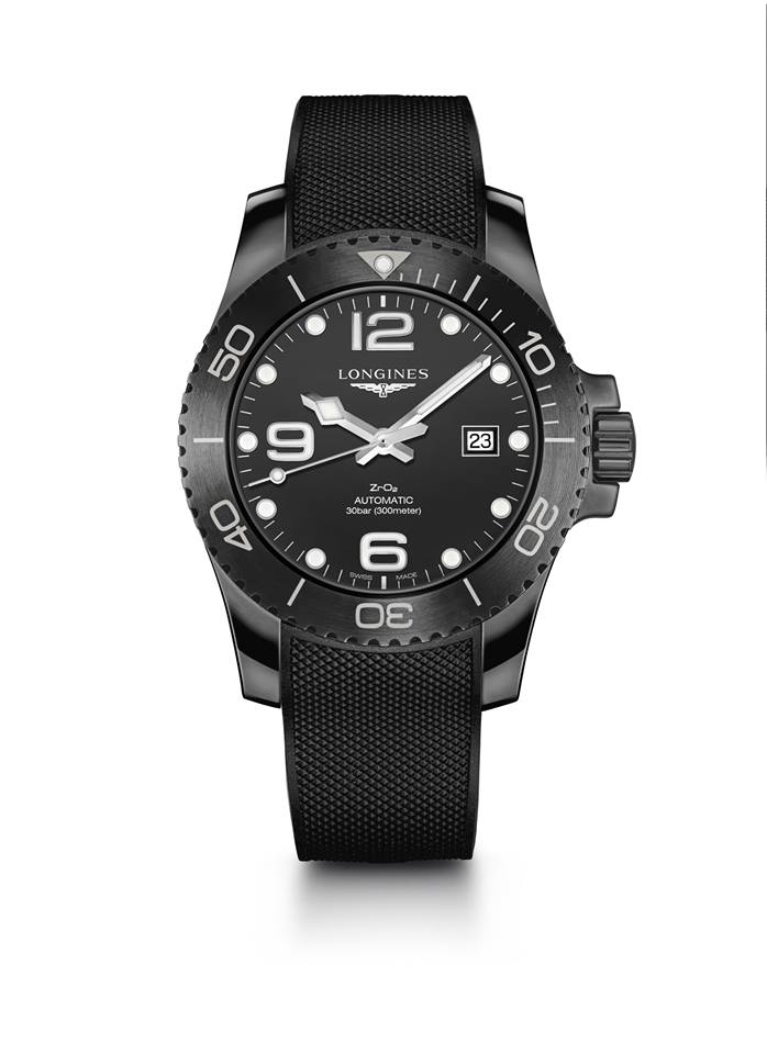 With this new timepiece, the brand goes even further in using this exclusive material with a model entirely made from black ceramic whose dial proudly displays its chemical composition: ZrO2. This highly technical and scratch-resistant material is well-suited to the sporty look of the new HydroConquest watch. Its boldness is further heightened by the different finishes of each of its components: a matte dial, a polished case, a round satin bezel and a back blending a circular satin and matte finish.