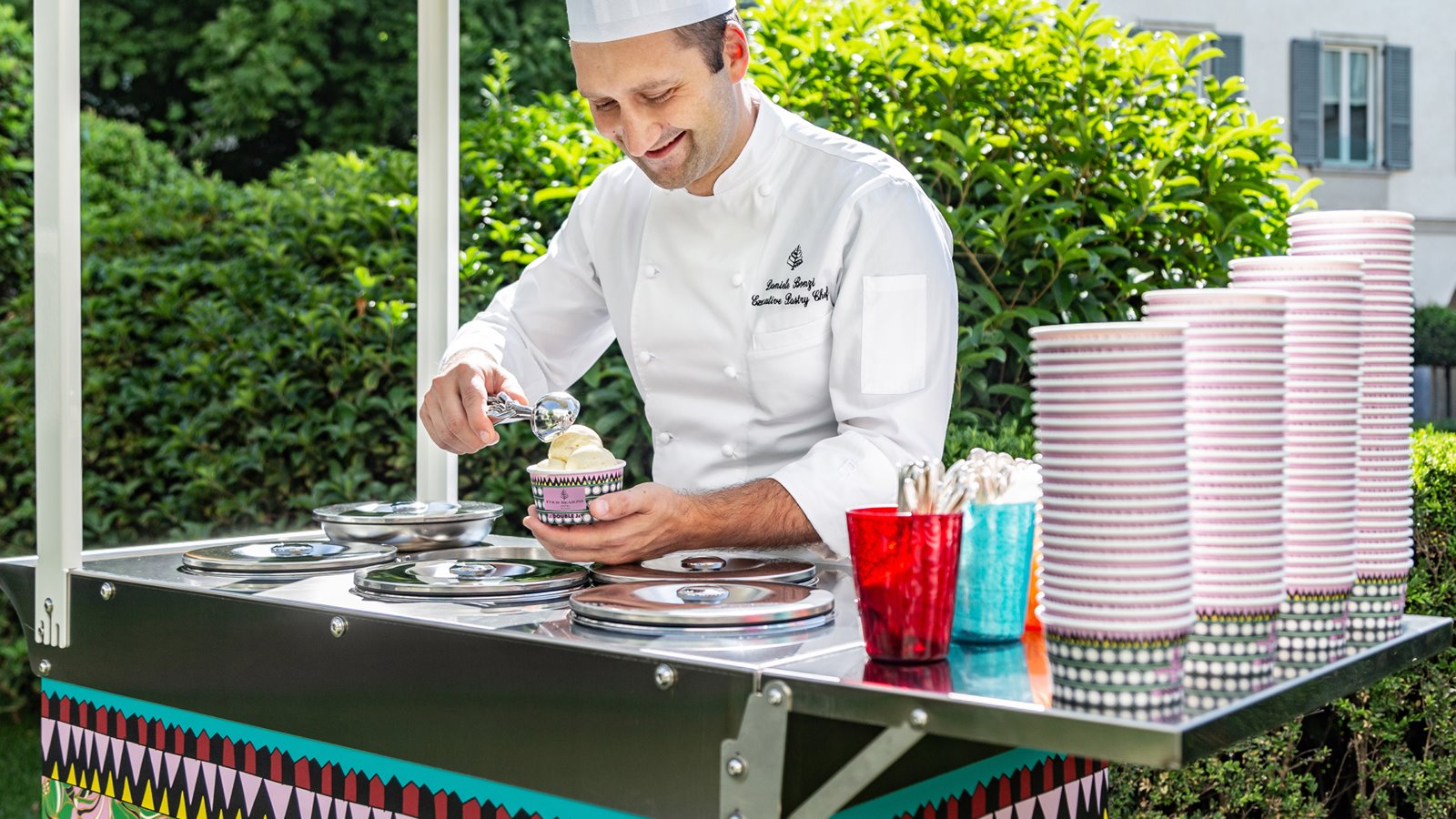 JJ Martin has used her creative flair to design and personalise the Hotel’s ice cream cups and cart, from where a range of exquisite ice creams are served. The playful cart adds a splash of colour to the elegant courtyard, while the ice creams are instantly Instagrammable, with their stylish vibrant cups topped with dreamy flavours.