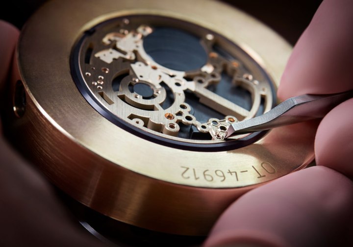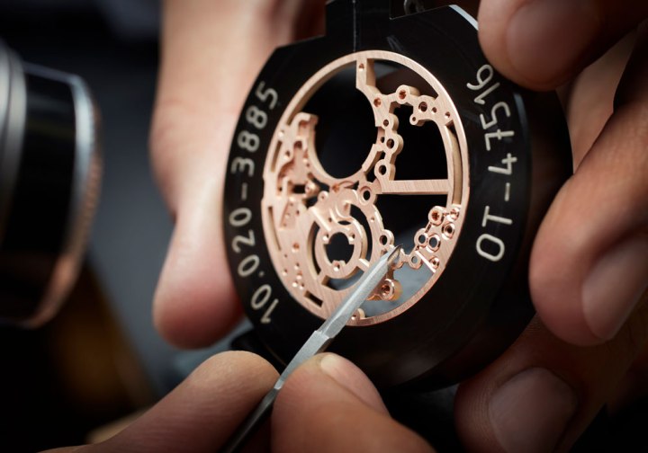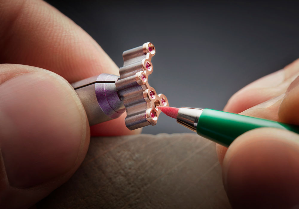 The gold plate and bridges have been hollowed out so as to display the mechanical anatomy of the movement. The challenge of this undertaking lies primarily in removing as much material as possible, while preserving the technical properties of the various different components. A truly novel watchmaking complication made even more challenging by the choice of gold. Once the chosen alloy has hardened, sophisticated expertise and care are needed to achieve the final result.