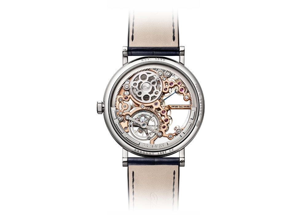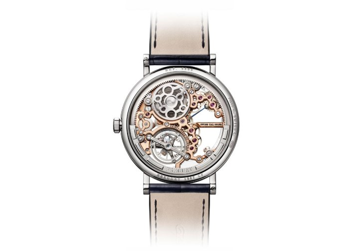 This masterpiece sits in a fluted case topped with a domed glass-box revealing the movement. The sapphire dial features applied hour markers in blued gold. The hours chapter is created using galvanic growth and the timer is laser-engraved and filled with blue varnish. Sophisticated and minimalist, this design is rounded off with traditional blued moon-tipped hands and soldered horns in the true Breguet style. Water-resistant to 30 meters, the Classique Tourbillon Extra-Plat Squelette 5395 is available with a gray movement in a rose gold case, or with a rose movement in a platinum case.