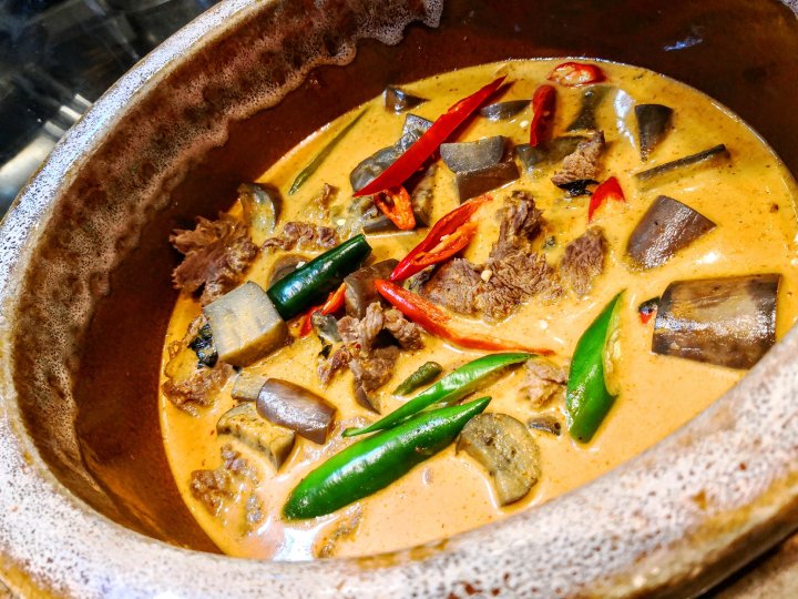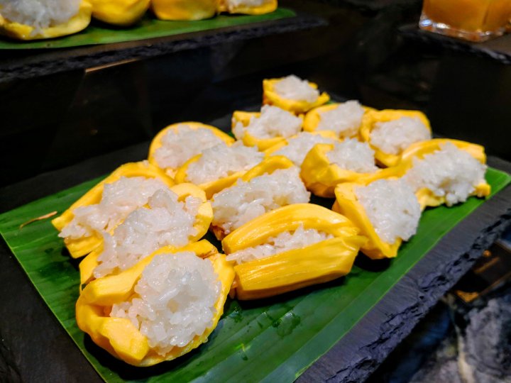 Desserts include Mango in Sweet Sticky Rice (Kaow Neaw Mamong), Water Chestnut in Coconut Syrup( Tam Tim Krob), Coconut Custard in Pumpkin ( Sangkaya Maprow Orn), Golden Egg Yolk in Syrup ( Foi Thong), Sweet Banana in Warm Coconut Soup ( Guey Buad Chee) and more!