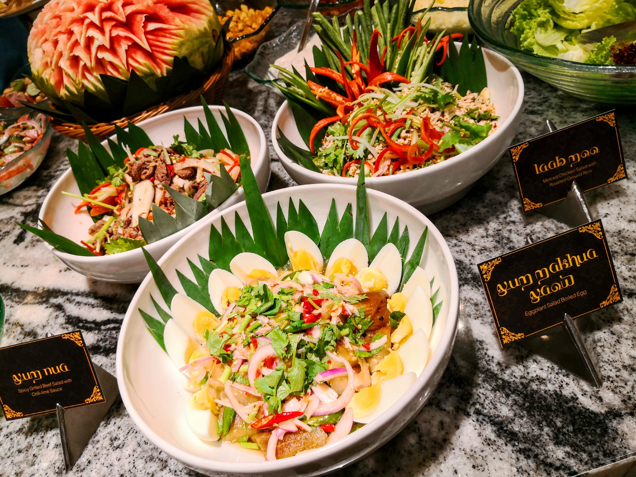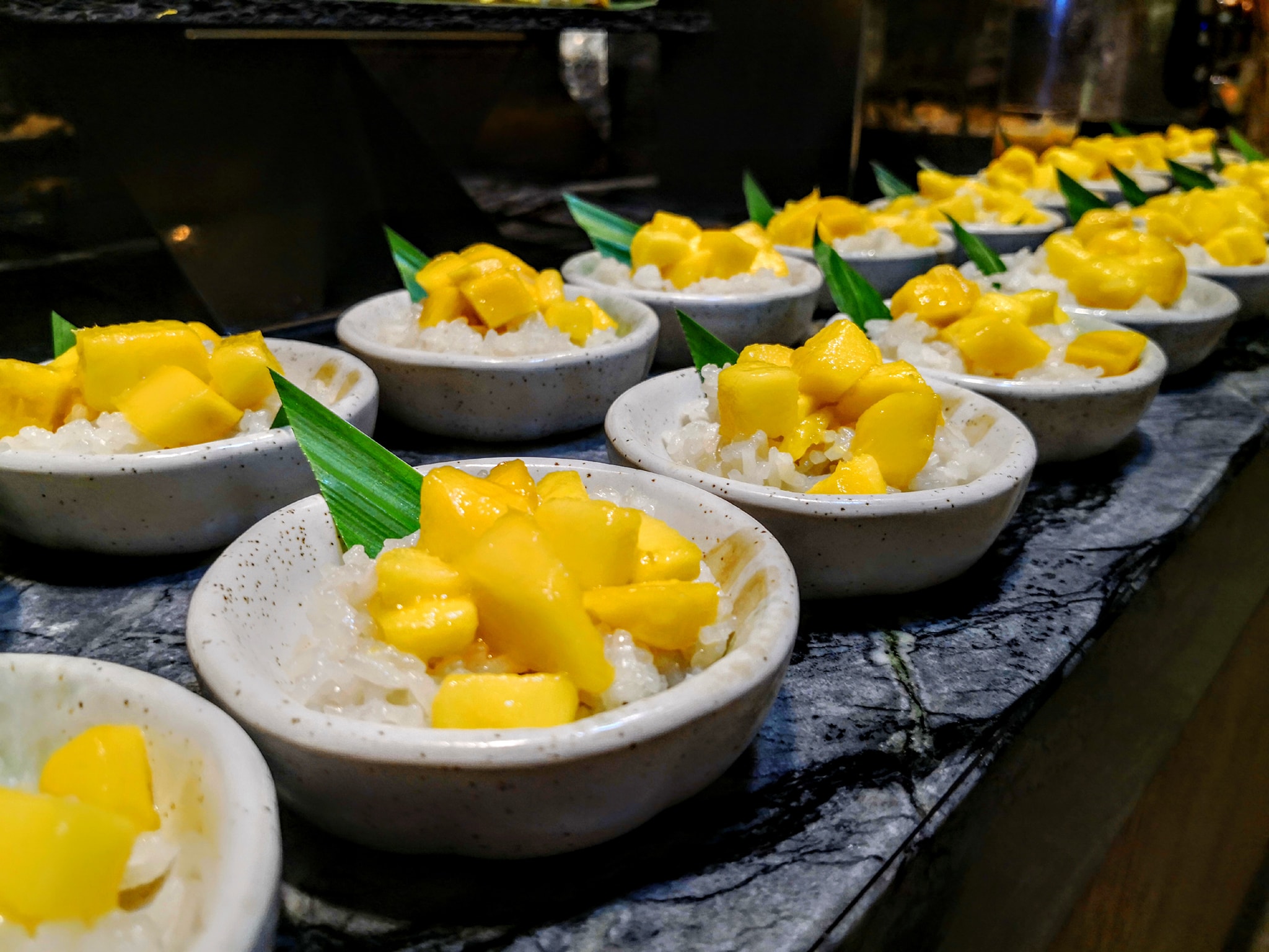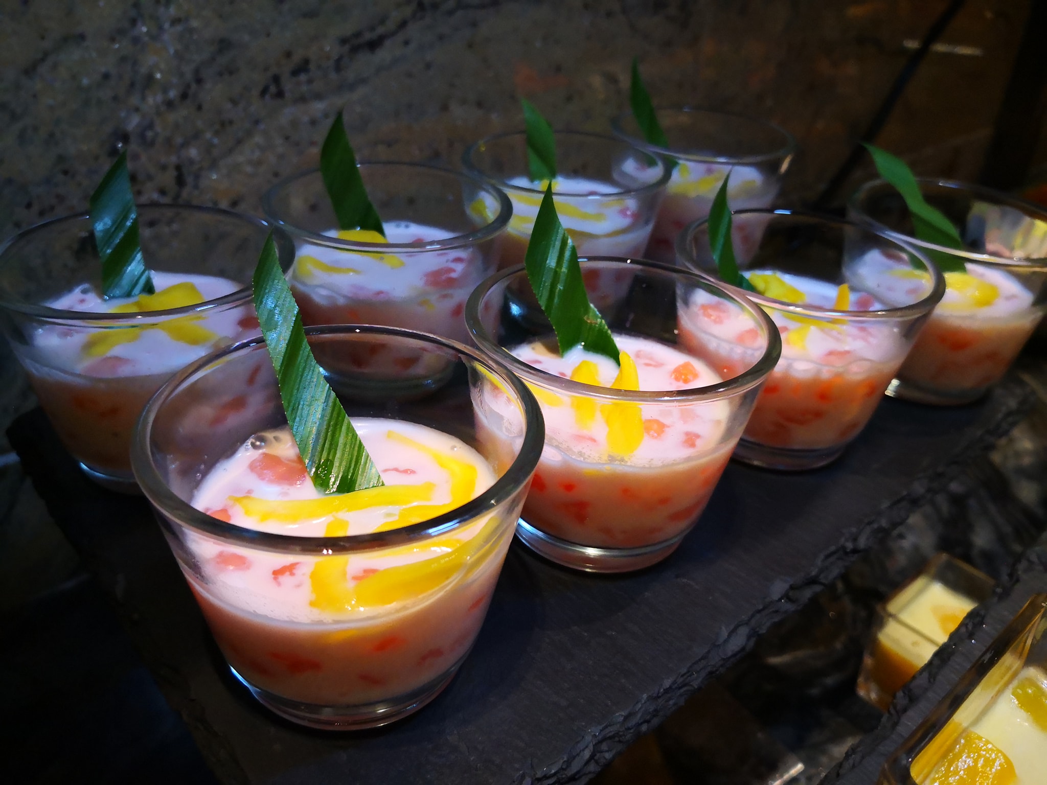 Desserts include Mango in Sweet Sticky Rice (Kaow Neaw Mamong), Water Chestnut in Coconut Syrup( Tam Tim Krob), Coconut Custard in Pumpkin ( Sangkaya Maprow Orn), Golden Egg Yolk in Syrup ( Foi Thong), Sweet Banana in Warm Coconut Soup ( Guey Buad Chee) and more!