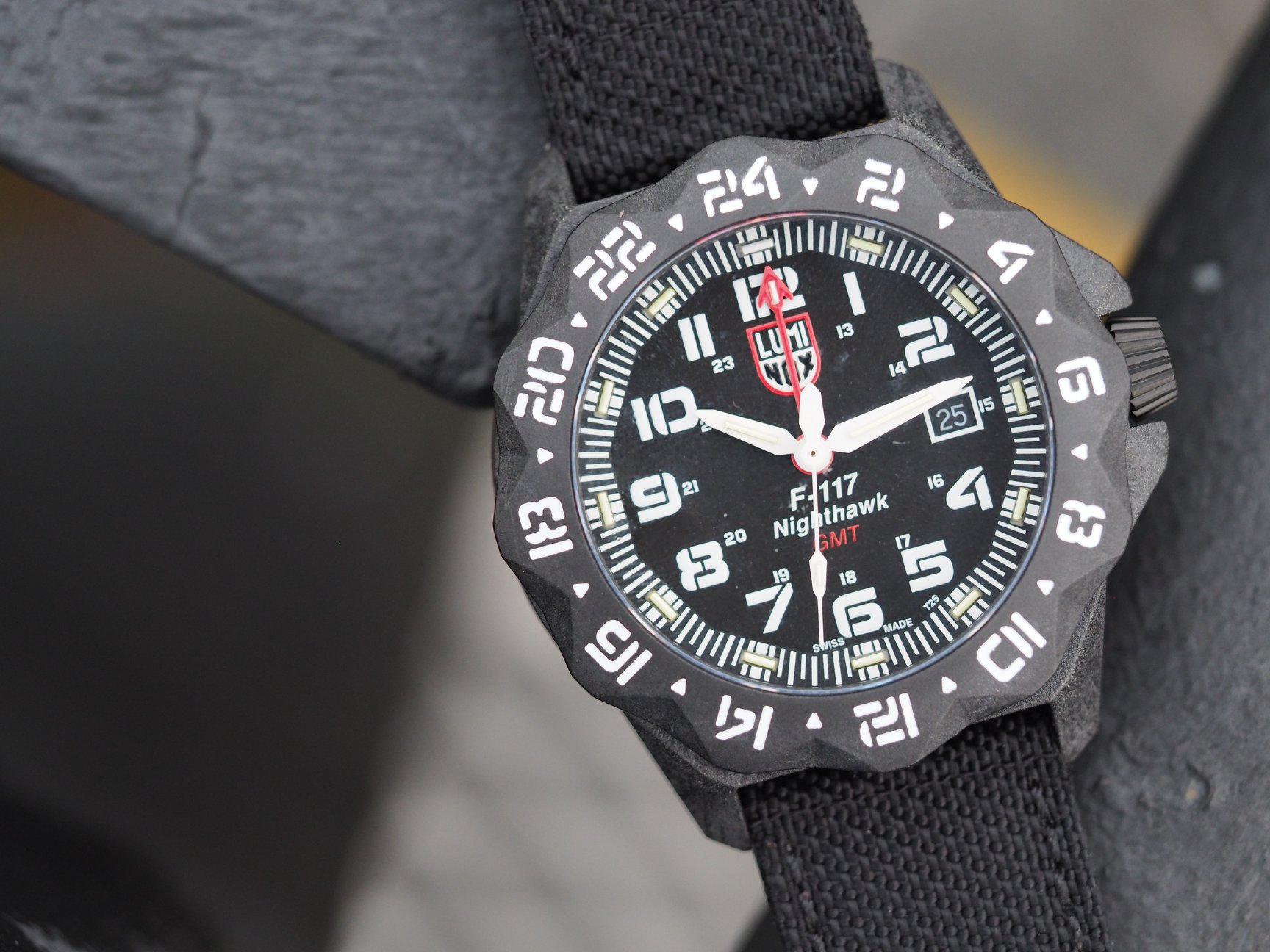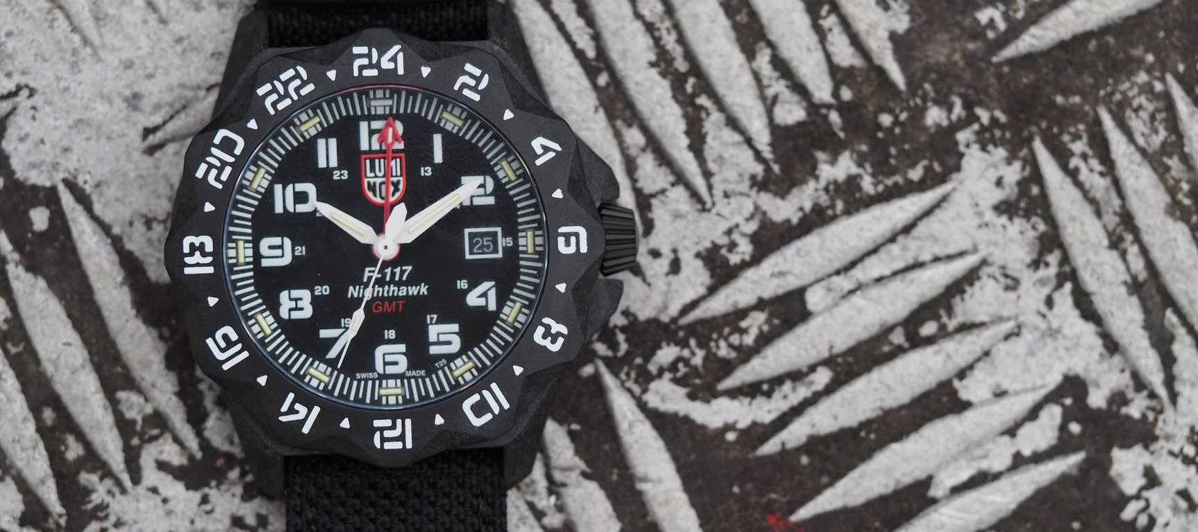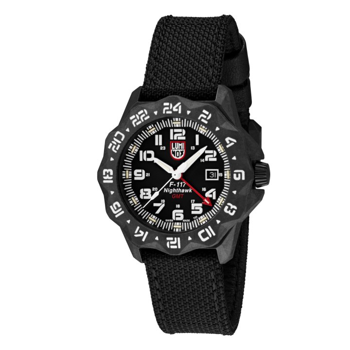 The F-117 Nighthawk 6440 Series is powered by a Ronda quart movement, which features a GMT indication (a nod to the F-117 Nighthawk’s time zone crossing nature) along with a date display at three o’clock. This versatile and attractive watch comes on a Kevlar strap with a Carbonox™ + buckle.