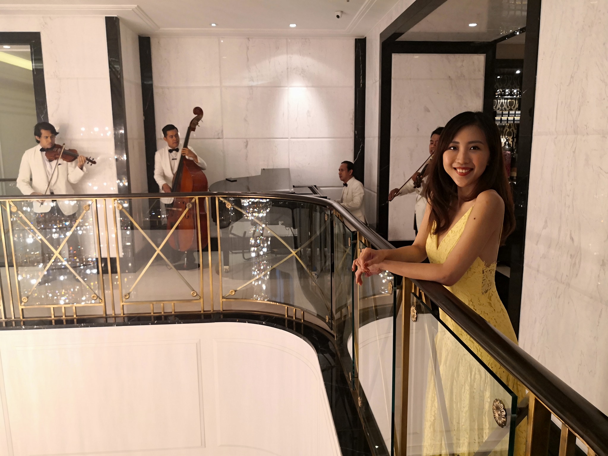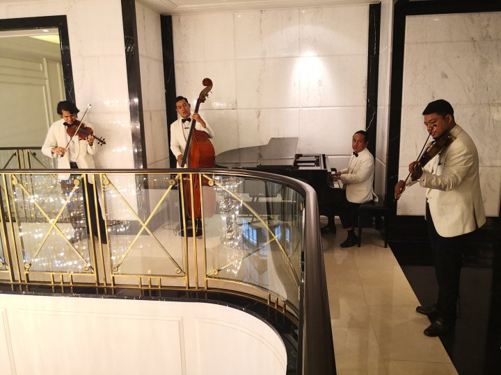 The lounge itself has a long layout, with comfy sofas and their tables well spaced from each other so you won’t eavesdrop on the next table’s conversation. The centre-piece of the lounge is the large chandelier, with a four piece string and piano band at the side playing classics as well as modern day songs.