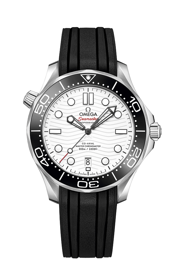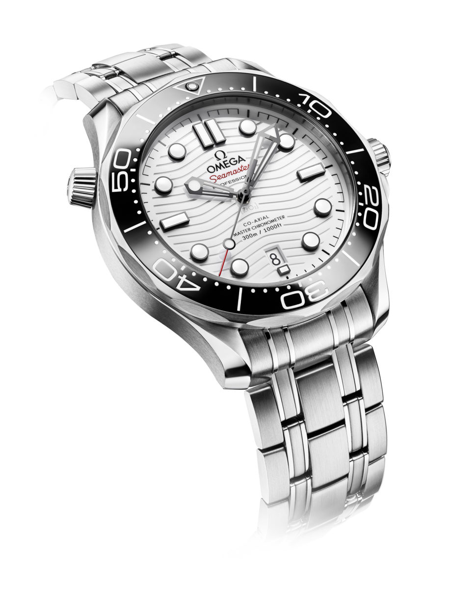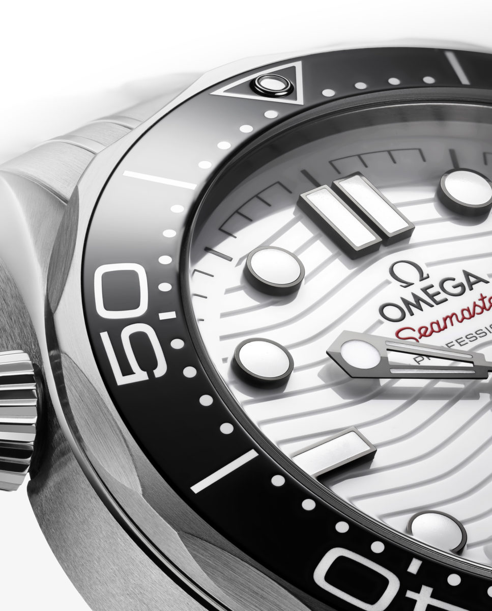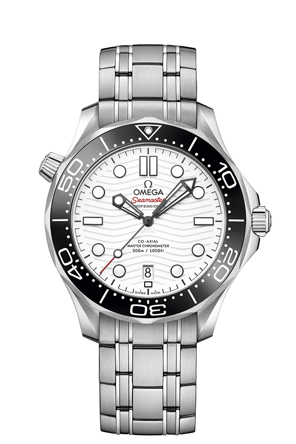 The new Seamaster Diver 300M model comes with a white ceramic [ZrO2] dial, which works perfectly with the surrounding black bezel and stainless steel case.