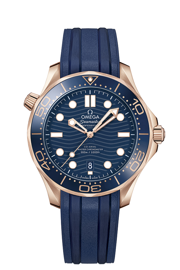 This 42 mm watch, crafted from 18K Sedna™ gold, includes a polished blue ceramic bezel with OMEGA Ceragold™ diving scale. Beautifully integrated with the case is a blue rubber strap with a buckle in 18K Sedna™ gold.
