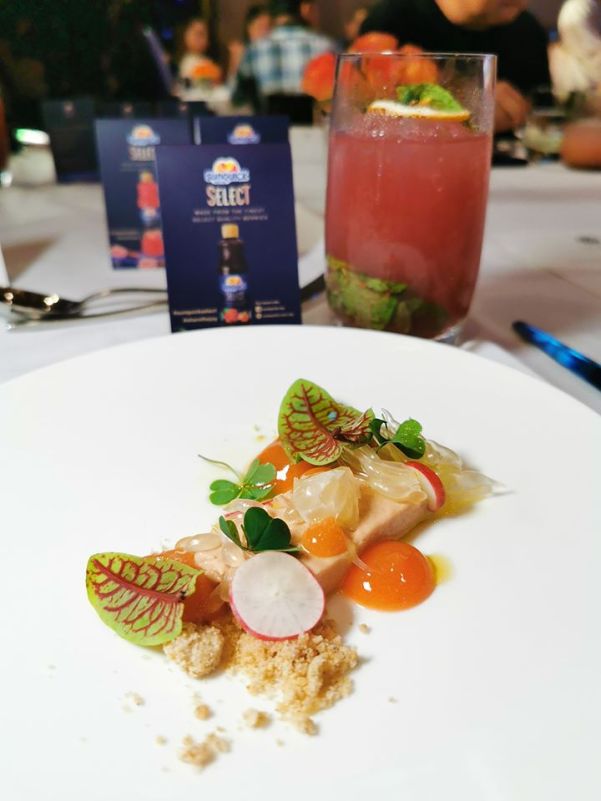 The first pairing of the evening was ‘Berries First Crush’ mocktail with Chicken Parfait infused with Sunquick Pink-Guava and Strawberry reduction, sorrel and savoury crumble. The combination of this pairing gave a delicate flavour, striking a balance between fresh tangy taste and sweetness. The mocktail was also complex and refreshing due to the use of ginger and hint of mint.