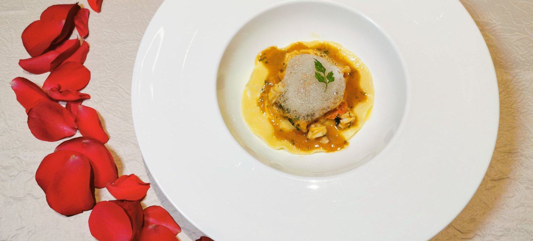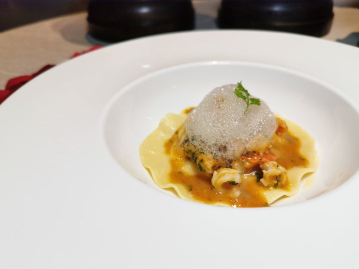 Raviolo di Salmone con Ragout di Mare e Cappuccino ai Funghi