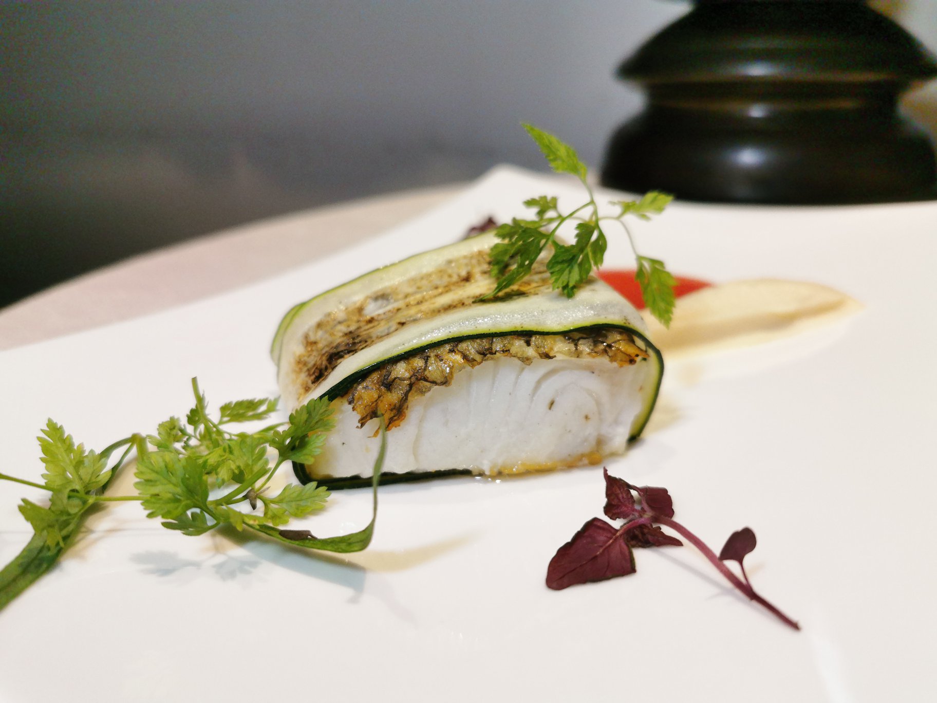 Wrapped Cod Fish in Zuchini served on Celeriac Puree and Tomato Essence