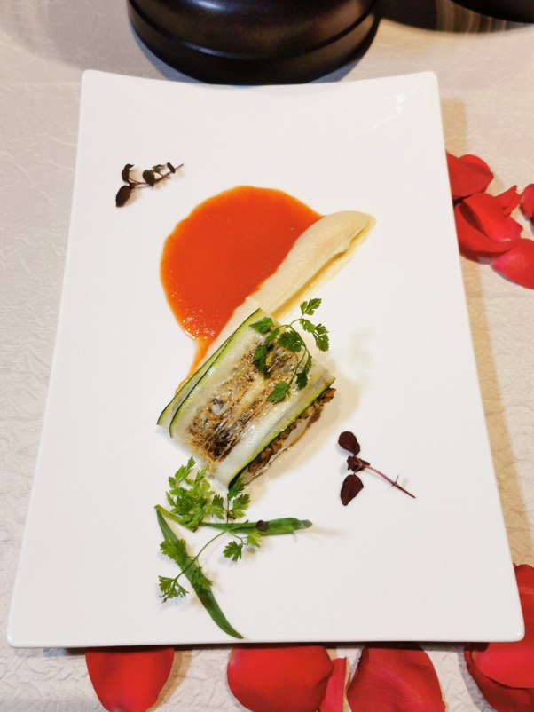Baccala Avvolto in Zuchini Servito su Purea di Pomodoro Con Purea Sedano Rapa