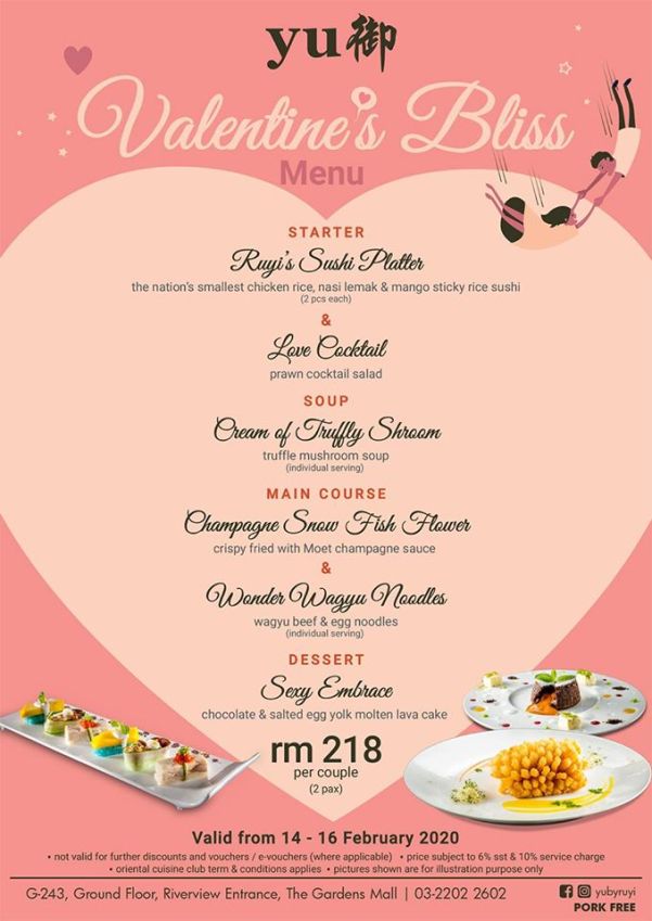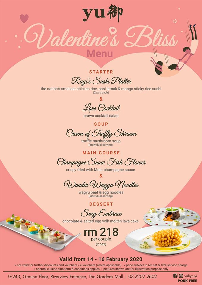The Valentine’s Day menu at YU 御 and RUYI & LYN 如意 is very affordably price at just RM218 per couple and is available from 14 to 16 February 2020.
