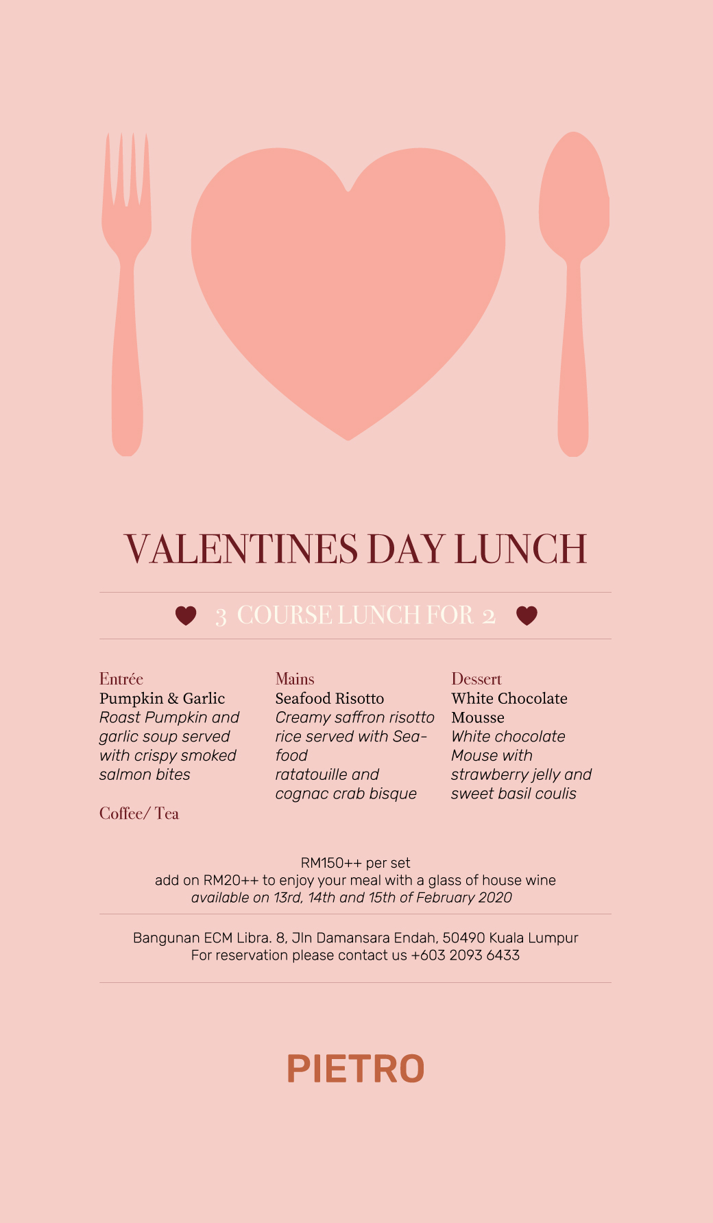 Joanne and I recently visited Pietro Ristorante Italiano in Damansara Heights, Kuala Lumpur to try their upcoming Valentine’s Day 2020 dinner menu. The restaurant also has a Valentine’s lunch menu and both menus are available from 13 February to 16 February 2020.