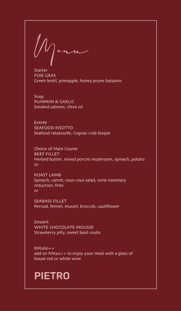 Foie Gras is one of my favourite ingredients and the one at Pietro certainly didn’t disappoint! Fully suggest that you add on a glass of house red wine (an additional RM20++) to go along with it.