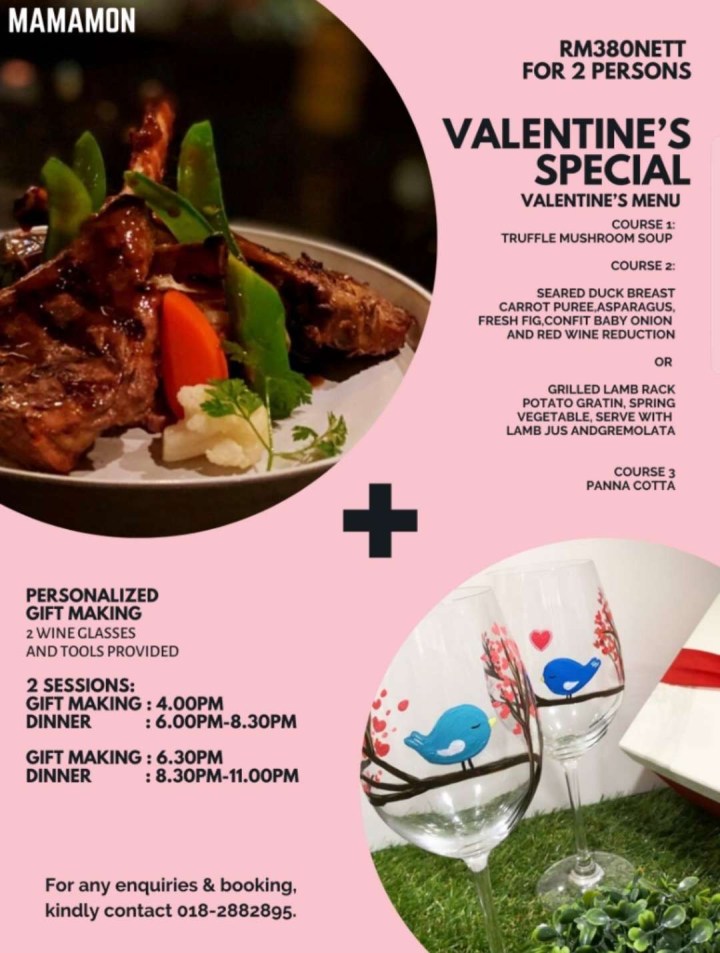 Looking for something special to do rather than just dining or movies to celebrate your Valentine’s Day? Mamamon has just the right thing to colour up your date with your loved one! Mamamon will be having a Valentine’s Dinner + Glass Painting Workshop on 14 February 2020 (Friday) priced at RM380nett for 2 persons with two (2) sessions available – 4.00pm or 6.30pm.