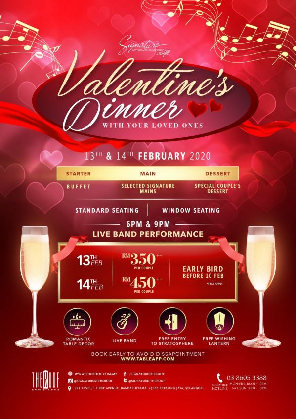 Treat your loved ones to a wonderful buffet dinner from starter, selected main course and special couple’s dessert at the Award Winning Signature at The Roof restaurant on 13th & 14th February 2020.