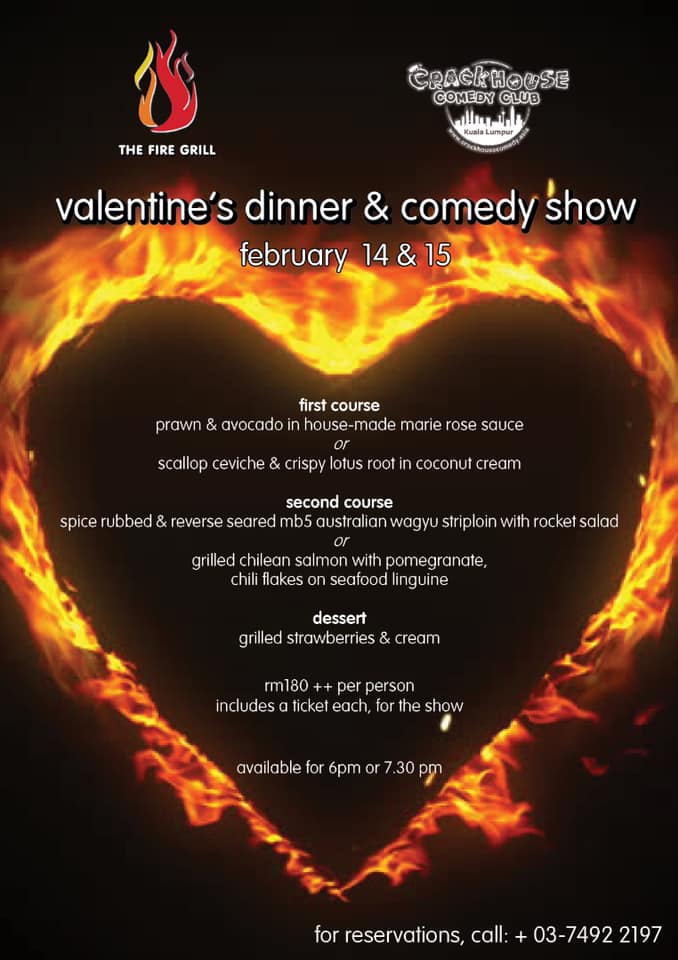 The Fire Grill in Taman Tun Dr. Ismail, Kuala Lumpur, will be having a “Valentine’s Dinner and Comedy” this 14th February 2020, presented by The Fire Grill in partnership with Crackhouse Comedy Club KL.