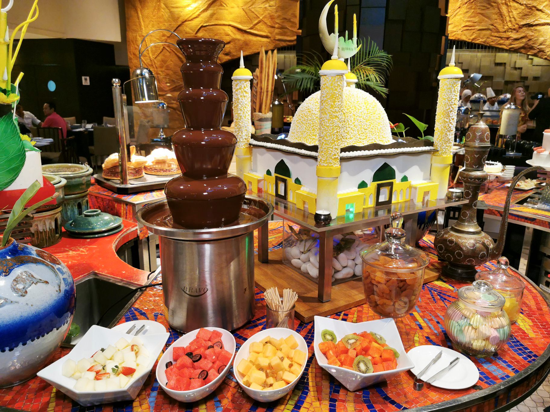 End the meal on a sweet note with desserts such as Exotic tarts, Pudding caramel, red velvet cakes, selected dates, Serawa durian, Chocolate fountain with fruit skewer & assorted marshmallow, Panna cotta, Assorted malay kuih and more.