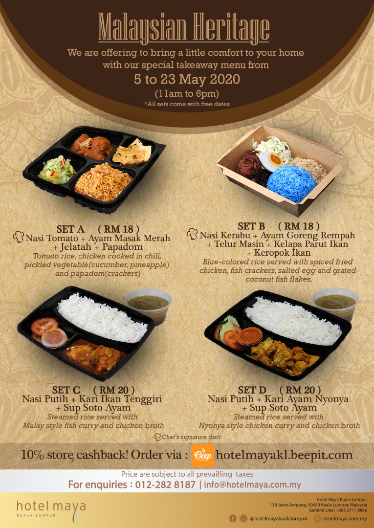 The Buka Puasa menu is available for delivery from 5 to 23 May 2020. Orders can be made via Storehub or hotelmayakl.beepit.com