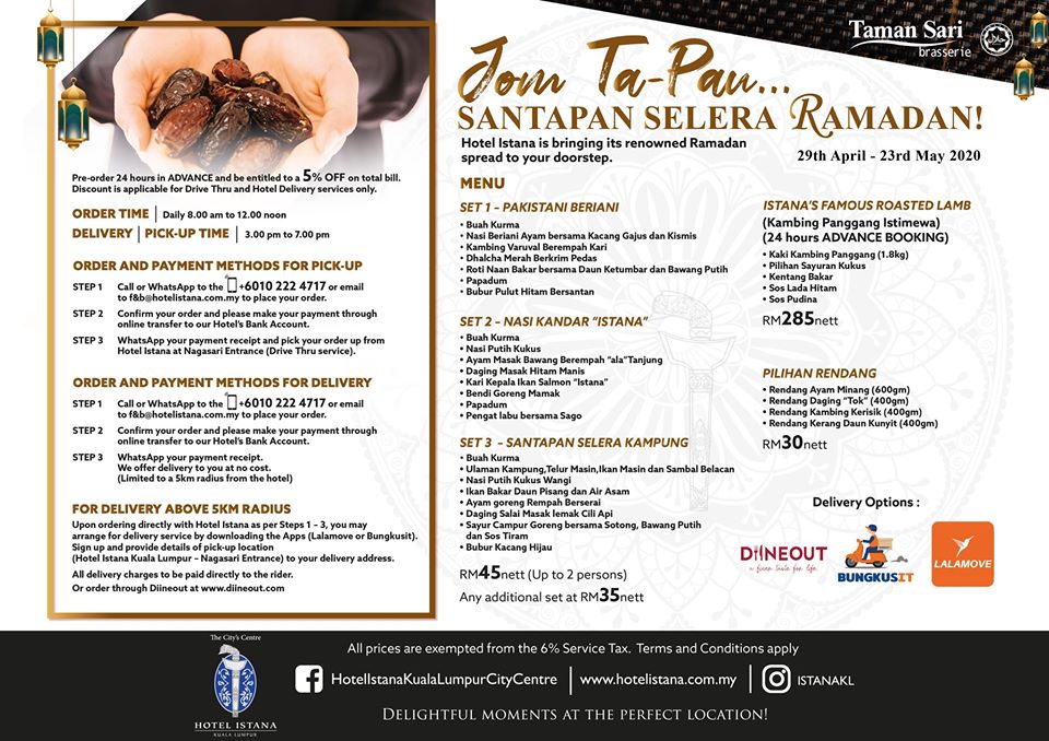 Delivery/Pick Up of Hotel Istana’s Ramadan Set Menus starts from 29 April until 23 May 2020. The order time will be from 8.00 am to 12.00 noon and delivery or pick-up is from 3.00 pm to 7.00 pm.