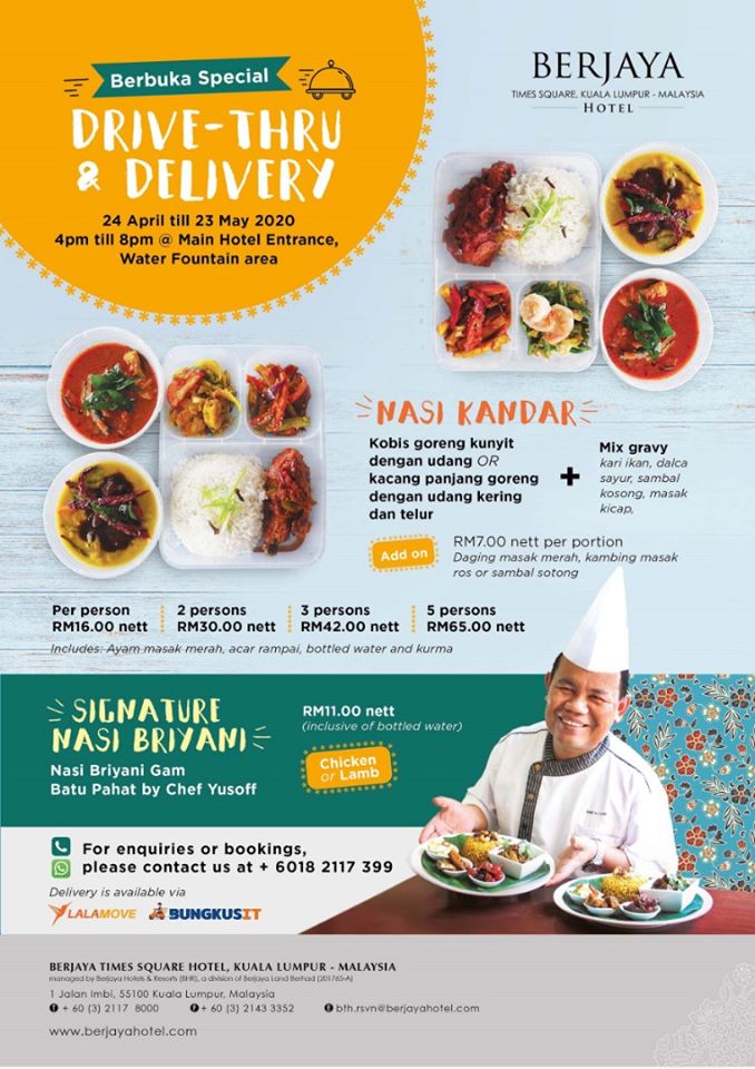 Berjaya Times Square Hotel presents the combo duo for Berbuka 2020 Promotions; Nasi Kandar and the Nasi Briyani Gam Batu Pahat (Chicken or Lamb) at the hotel’s entrance (near the water fountain). Both of these Ramadhan 2020 promotions will run throughout the entire month of Ramadhan, which is from 24 April 2020 to 23 May 2020.