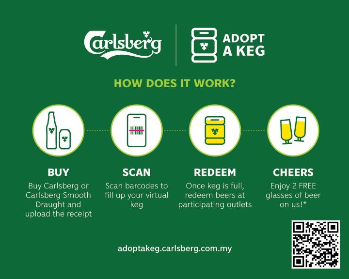 Redemptions for Adopt a Keg are limited to the first 10,000 consumers, with a total of 20,000 free glasses of Carlsberg beer to be given away. Consumers can redeem their complimentary beer at participating outlets of their choice from 1 June until 31 August or while stocks last.