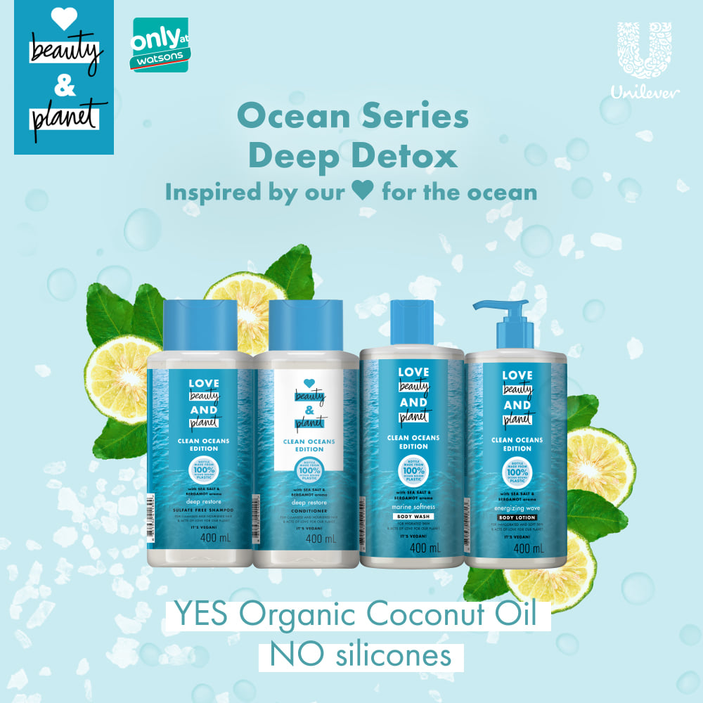 The newly introduced Love Beauty and Planet’s Clean Oceans Edition focuses on ocean-associated recycled waste to form the base of an exciting new line of hair and skin self-care routine. Love Beauty and Planet’s Clean Oceans Edition Deep Detox range is incorporated with a rising key beauty ingredient, natural sea salt. This simple yet powerful ingredient contains minerals and other oceanic components known to help purify, balance, and restore hair and skin health without stripping away natural oils. The Deep Detox sea salt and bergamot shampoo cleanses and detoxes the scalp, getting rid of excess dead skin and residues. Sea salt can also aid with gentle natural exfoliation that does not harm sensitive skin in any way. It is an ingredient known to help cleanse pores, while balancing oil production and retaining moisture from within, leaving skin feeling soft and invigorated. It is complemented by the scent of bergamot that has a bittersweet, fruity note and mild, spicy undertones that is truly memorable. The Deep Detox range is also complemented by sun-drenched bergamot that is ethically sourced from Italy during the harvest season between the months of November to March.