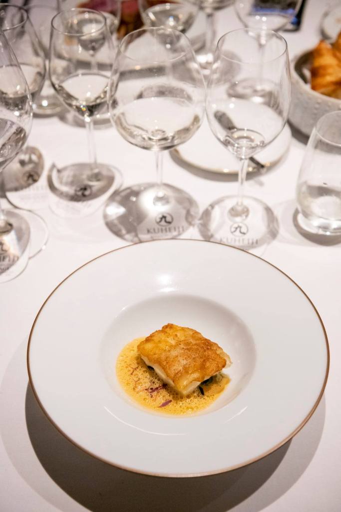 Norwegian wild Skrei Cod encrusted with crispy edible potato scales, carrot puree, black trumpet mushrooms, whipped beurre blanc sauce