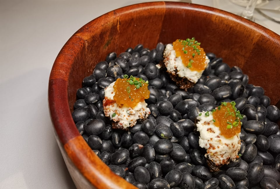-Crispy White fungus in mushroom stock, fresh goat cheese and bottarga boreale skrei pearls