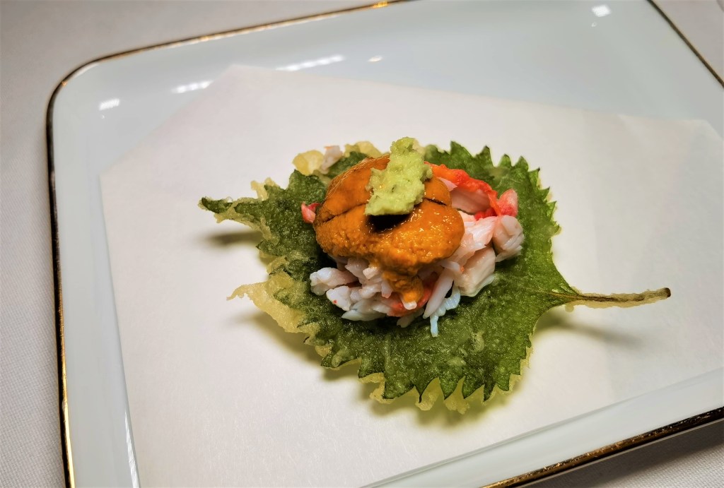 -Tempura of oba leaf with king crab, Uni and fresh wasabi-