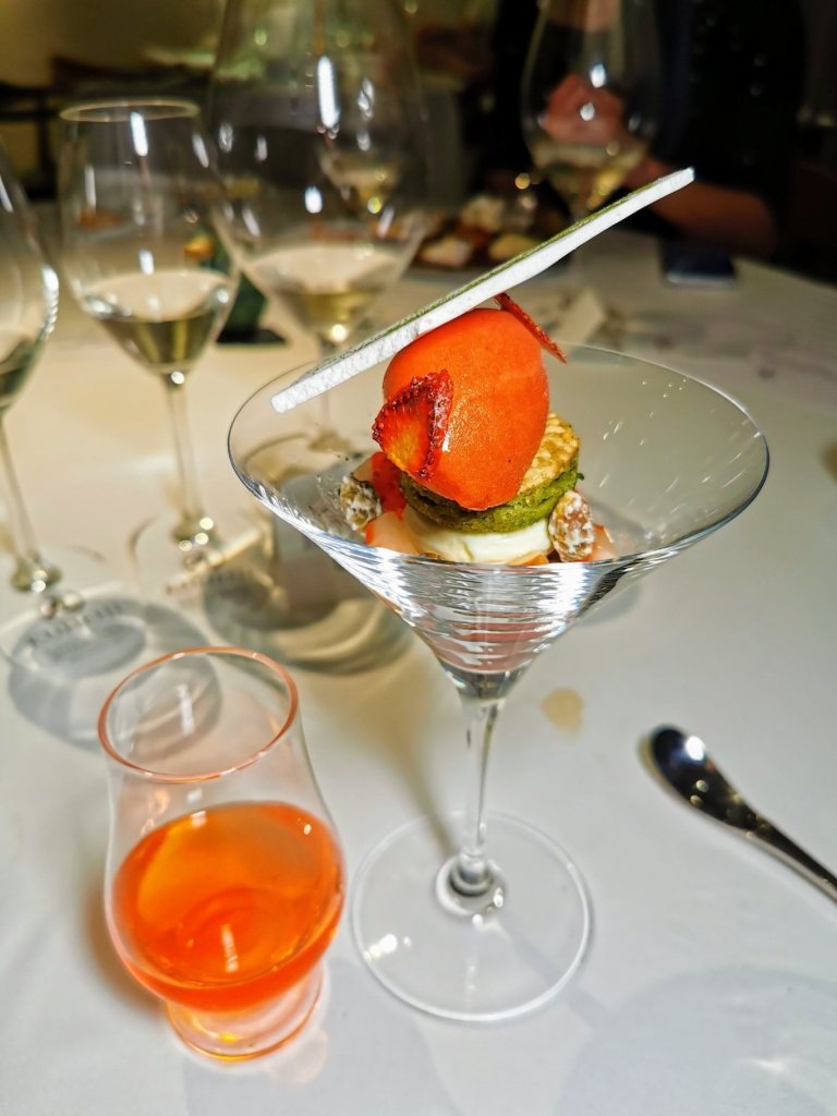 Chitose Cameron strawberries in honey and lime, white chocolate mousse wrapped in strawberry gellee, pistachio dacquoise, yuzu-strawberry tarragon sorbet.