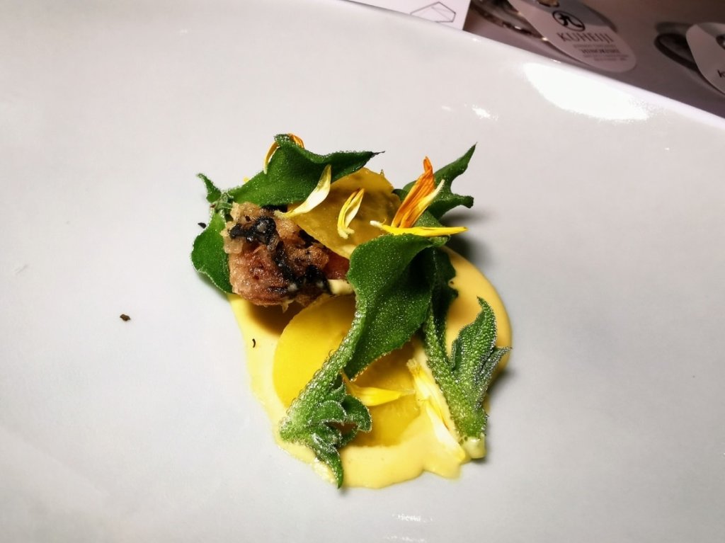 Tempura, sweet corn velouté, Lofoten umami sprinkle, white & yellow heirloom beets