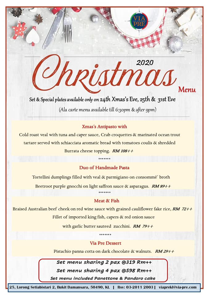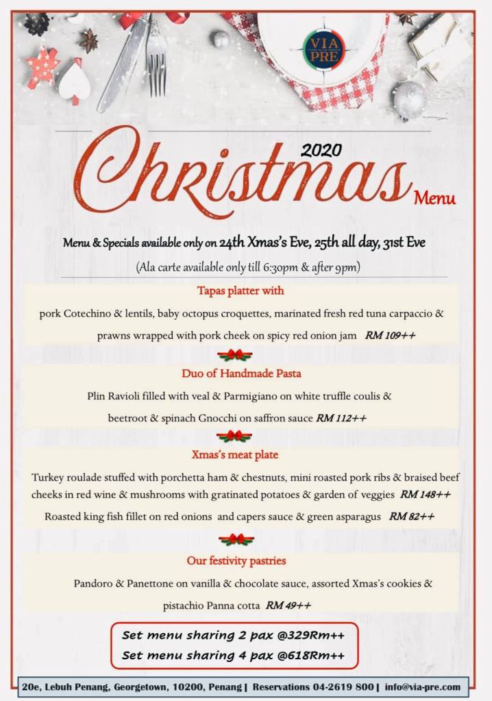 Via Pre Kuala Lumpur and Penang have prepared a special Christmas and New Year Set menu that is available only on 24, 25 and 31 December 2020 (the a la carte menu will be available till 6:30pm and after 9pm).