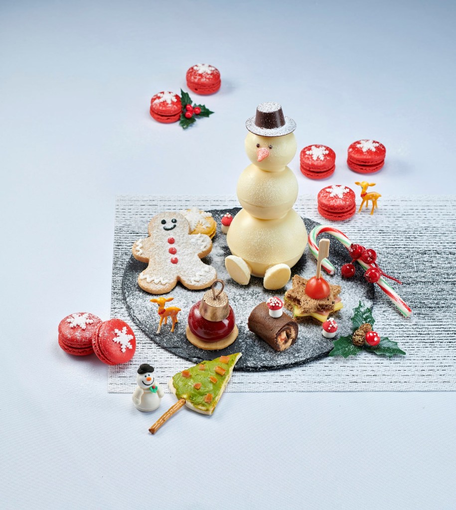 Among the festive desserts for this Christmas Afternoon Tea are Mini Chocolate Amaretto Yule Log, Red Velvet Macaron with Cream Cheese Frosting, Apple and Cinnamon Christmas Pudding, Green Tea Tart, Christmas Chocolate Fudge Cake, Raspberry Cheesecake, Christmas Cookies, Plain and Raisin Scones, Strawberry Jam and Clotted Cream. Accompanying the selection of bites is a comprehensive medley of teas, freshly brewed coffee and juices.