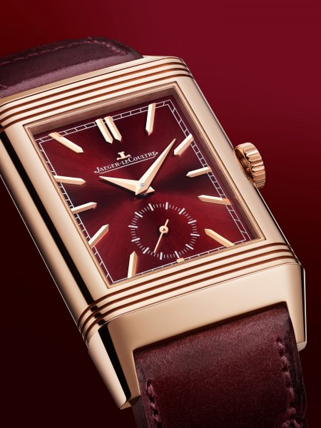 On the front dial, in keeping with the original Reverso design, the hours are marked by straight indexes, doubled at 12. Their faceted shape adds visual depth to the rich burgundy-red of the lacquered surface and echoes the form of the Dauphine hands. The circular track of the small seconds display at six o’clock provides a counterpoint to the linear geometry of the dial and case.