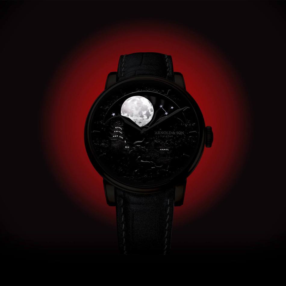 Golden and glittering by day, the luminous, hand-painted scene comes alive at night. The refined series perfectly expresses the expertise and artistry of Arnold & Son while continuing the Swiss watchmaker’s ongoing exploration of rare minerals.