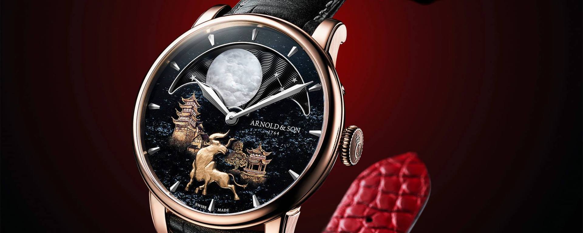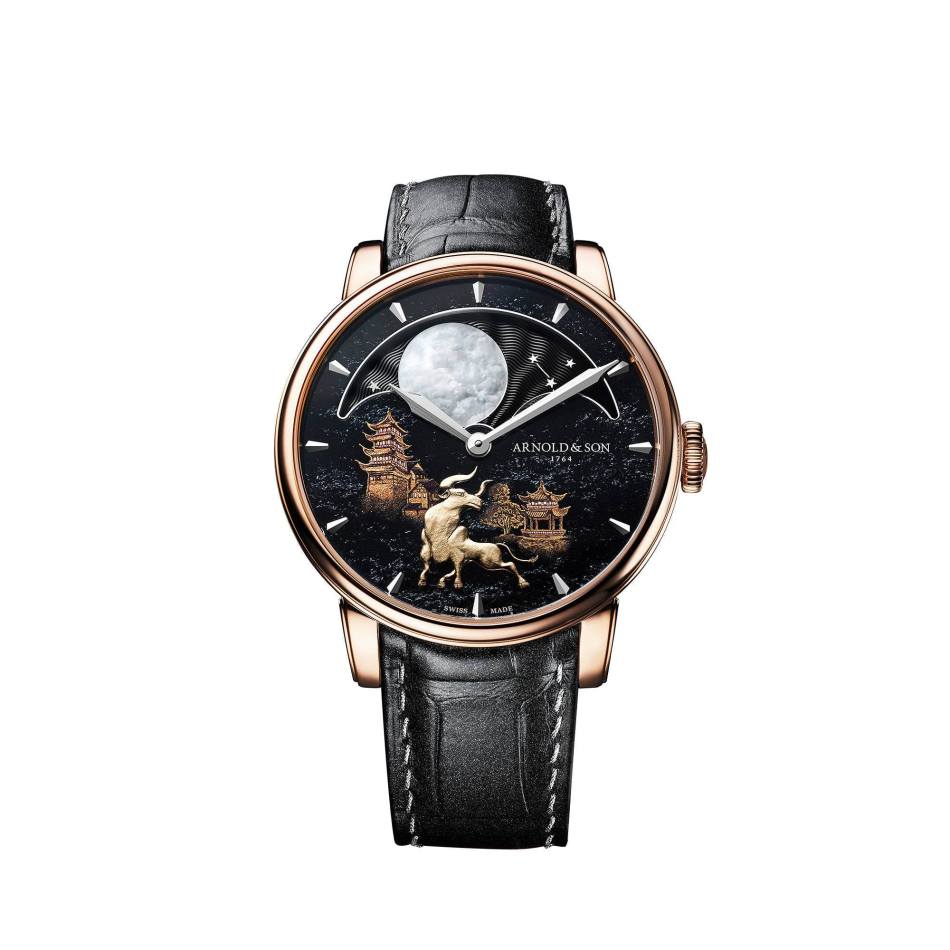 In honor of the Chinese zodiac calendar’s year of the Metal Buffalo, Arnold & Son has produced a new 8-piece production of the Perpetual Moon “Year of the Ox.” Their glittering hematite dials feature a majestic golden buffalo stationed beneath an oversized mother-of-pearl moon.