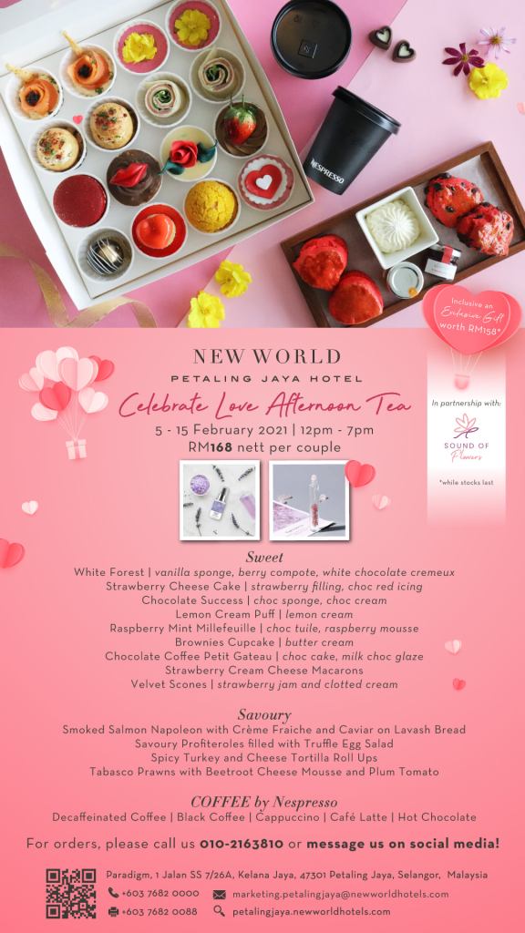In partnership with Sound of Flowers, New World Petaling Jaya Hotel will be presenting a lovely Afternoon Tea set inspired by Sound of Flower’s self-love philosophy this coming Valentine’s Day. For a romantic start to the season, New World Petaling Jaya Hotel is serving a feast of sweet and savoury afternoon tea treats in rosy hues from 5-15 February 2021. Priced at RM168 nett for two guests, the Celebrate Love Afternoon Tea promises to melt any heart, featuring the Smoked Salmon Napoleon with Crème Fraiche and Caviar on Lavash Bread and Raspberry Mint Mille-feuille.