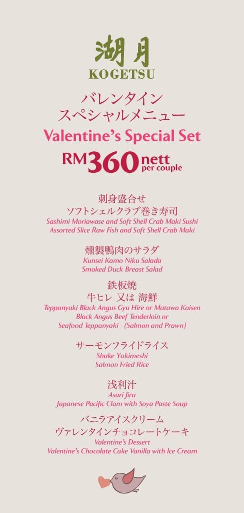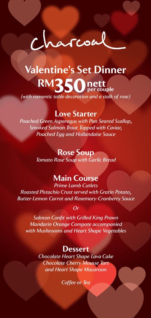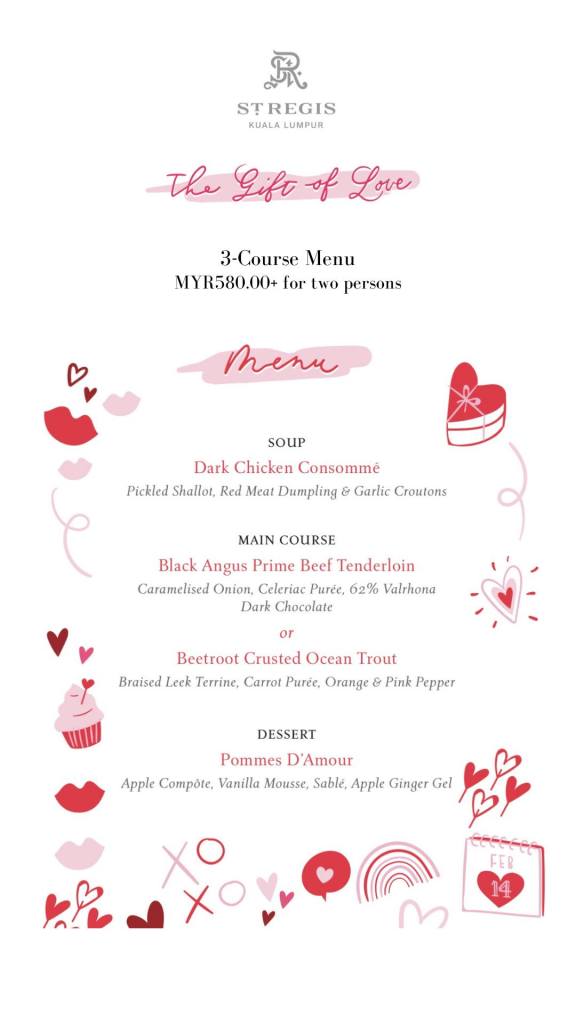 - Love @ First Bite at MYR 399 nett per couple (three-course set menu, includes a rose and box of pralines)