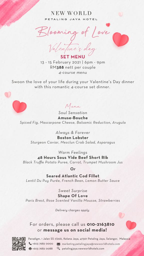 New World Petaling Jaya Hotel presents a special Valentine’s 4-course menu entitled “Blooming of Love Valentine’s Day” which is available for takeaway from 13 to 15 February 2021 between 6 pm to 9 pm. This set is priced at RM388 nett per couple.