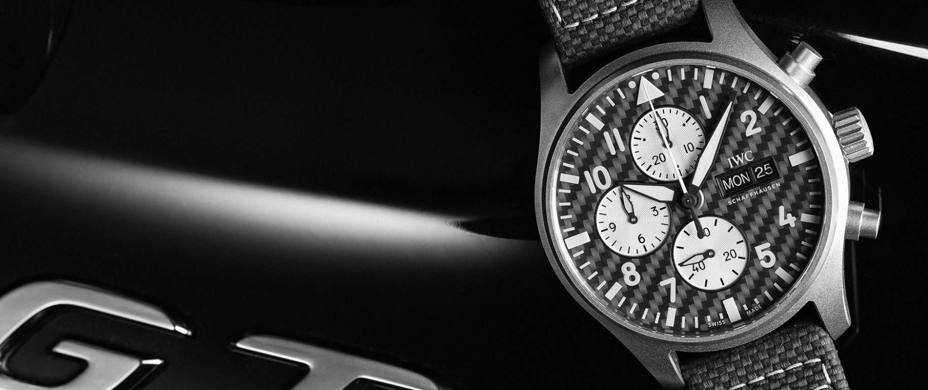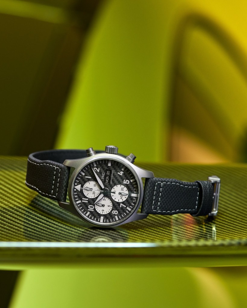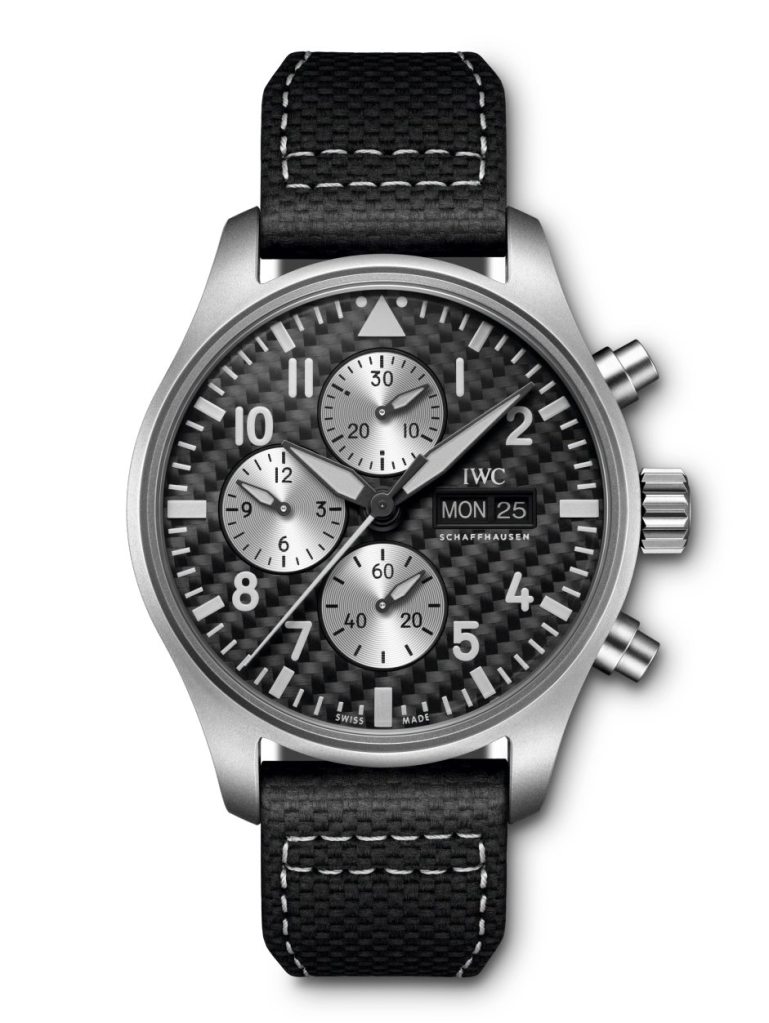 Crafted from automotive engineering materials, the Pilot’s Watch Chronograph Edition “AMG” (Ref. IW377903) is IWC‘s first 43mm Pilot‘s Watch Chronograph featuring the IWC-manufactured 69385 calibre, as well as the first Pilot‘s Watch Chronograph with a case made of extremely light and scratch-resistant titanium. The Grade 5 titanium finish gives the watch its matte grey appearance, inspired by AMG‘s signature Selenite Grey Magno paint finish. The dial features precisely woven carbon fibre, a material directly derived from AMG‘s aero components. These parts are produced in a complex process involving heat and pressure and are known for their remarkable lightness and rigidity. The raw material is continuous carbon fibres, which are processed on weaving machines into textile structures, giving the end product its characteristic woven “carbon look”. The black carbon dial provides the perfect contrast to the silver chronograph sub-dials, reminiscent of motorsport instruments.