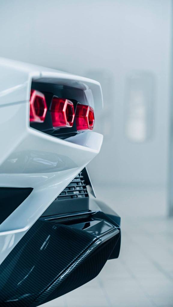 The rear of the Countach LPI 800-4 is immediately recognizable from its distinctive inverted wedge shape, with the rear bumper featuring a lower, sleeker line, and the ‘hexagonita’ design shaping the three-unit rear light clusters. The LPI 800-4 sports the four-strong exhaust tailpipes of the Countach family, connected within the carbon fiber rear diffuser. Access for driver and passenger is of course via the infamous scissor doors, first introduced on the Countach and that have become a Lamborghini V12 signature.