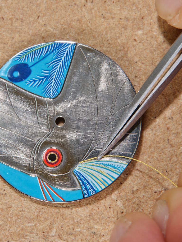 The white gold base is first enamelled. The artisan uses a very fine brush to coat it with glass powders mixed with natural oils, which are then applied in several layers, dried and fired in the kiln. Recesses to house the silk threads are engraved around the enamelled surfaces. Each thread is meticulously positioned and fixed into place with infinite care so as to create subtly shimmering light and preserve a perfect weave.