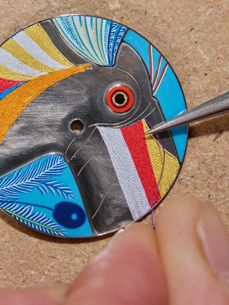 Its dial associates two highly demanding and remarkable crafts that took five years to perfect: multicoloured silk threads, highlighted by the intensity of the miniature enamel. The unique and exclusive Hermès silk thread technique was inspired by a kimono weaving workshop in Japan. Chosen for its vibrant design, the Amazonian bird is composed of 500 individually assembled threads and is brought to life by a full week of fine craftsmanship.