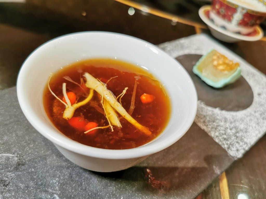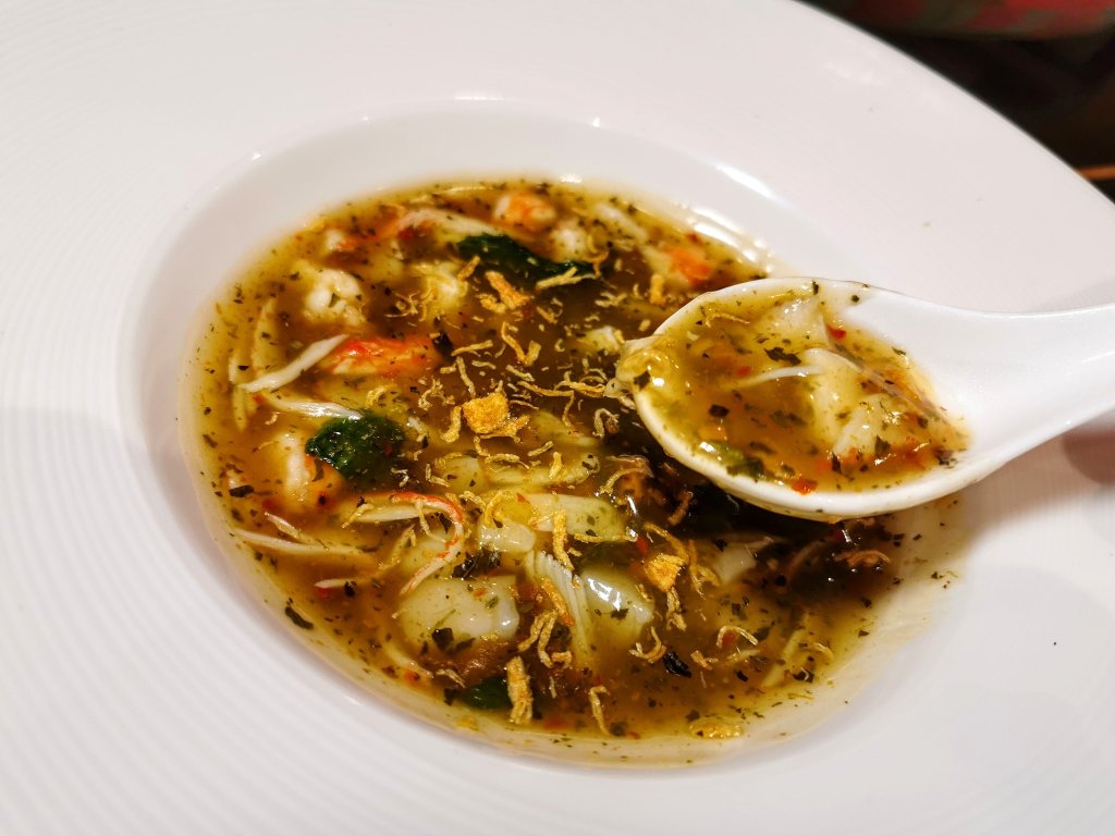 Next up is the Assorted Seafood Soup with Blended Mint that’s both heart-warming and refreshing. The Simmered Vegetables with Egg White and Watermelon gives a light contrast to the deeper, richer flavours of other dishes, while the hearty and flavourful Wok-Seared Fresh Water Prawns with Homemade Egg Drop, Chili Sauce and Egg Fried Rice is a really impressive main, exploding with flavour!