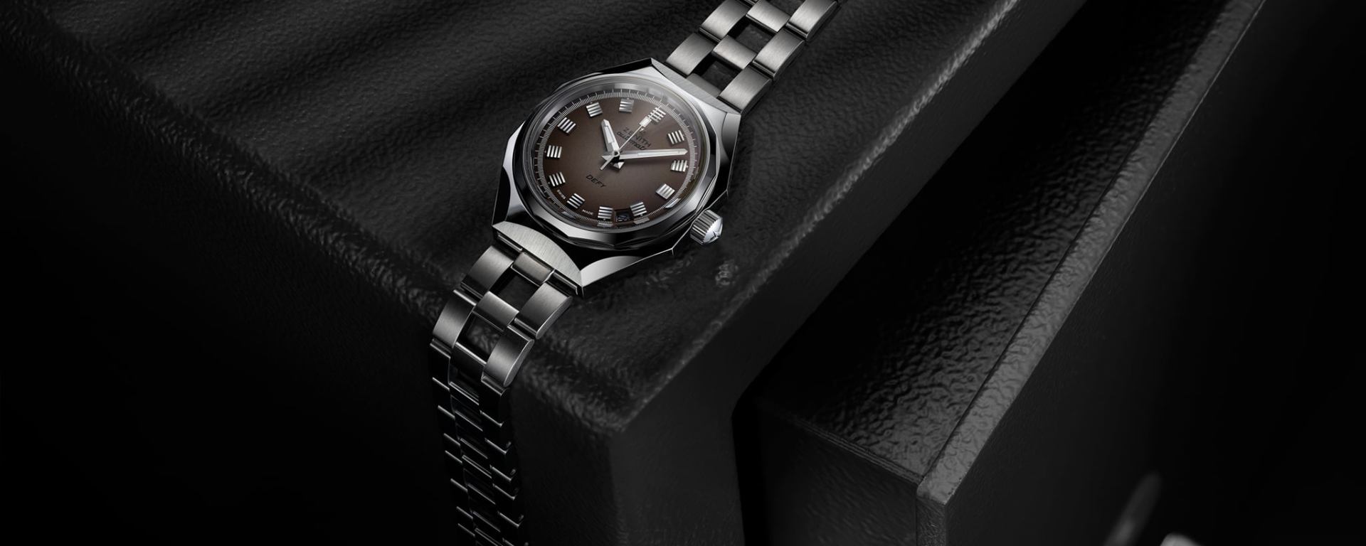 The vessel for this audacious mindset was the DEFY A3642, opening new avenues of design and performance for the Manufacture to explore. The A3642 was fittingly nicknamed the coffre-fort in French, which translates to “bank vault” or “safe-deposit box”. Its bold, octagonal case paired with a fourteen-sided bezel is all about exhibiting audacity and ruggedness through sharply defined lines and facets with different finishes; something that has been distilled into the modern Zenith DEFY collection. With its steel “ladder” bracelet designed and manufactured by the famed Gay Frères company, the original DEFY was certainly ahead of the curve when it comes to sporty steel bracelet watches with highly geometric designs. With a water-resistance of 30ATM (300 metres) ensured by a screw-down crown, the DEFY A3642 and its modern Revival reincarnation are assuredly all-terrain and all-occasions watches.