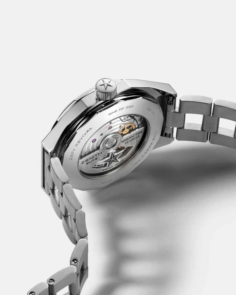 On the inside, instead of the original’s solid case back emblazoned with a four-pointed star that became one of the brand’s logos and recurring design element for years to come, the DEFY Revival A3642 features a sapphire display back showing the automatic Elite 670 manufacture movement, operating at a frequency of 4 Hz (28’800 VpH) and delivering a power reserve of 50 hours when fully wound.